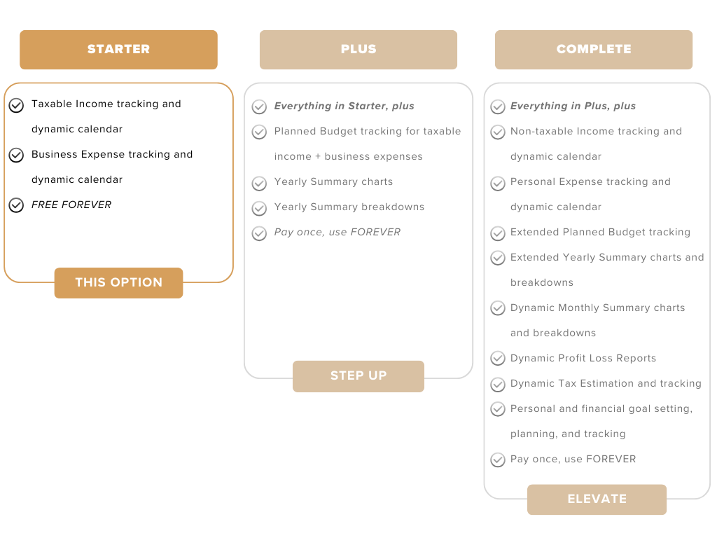 Elevate to the Complete edition to get a holistic view of your total financial health — not just your business. You’ll gain access to dynamic monthly summaries, detailed profit & loss reports, personal expense and non-taxable income tracking, expanded budget planning, tax estimation, goal-setting and progress tracking tools, and much more. Pay once, use forever.