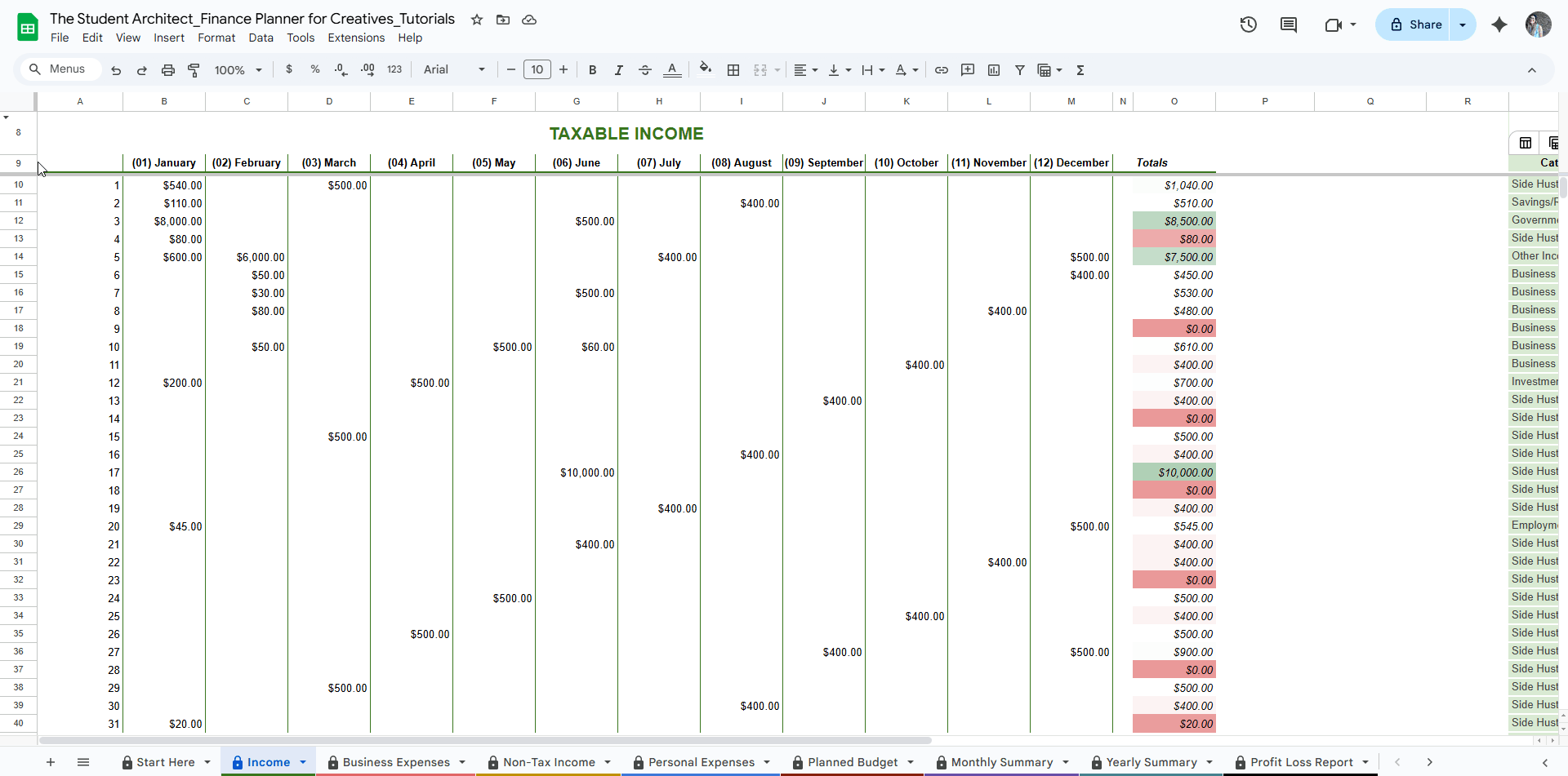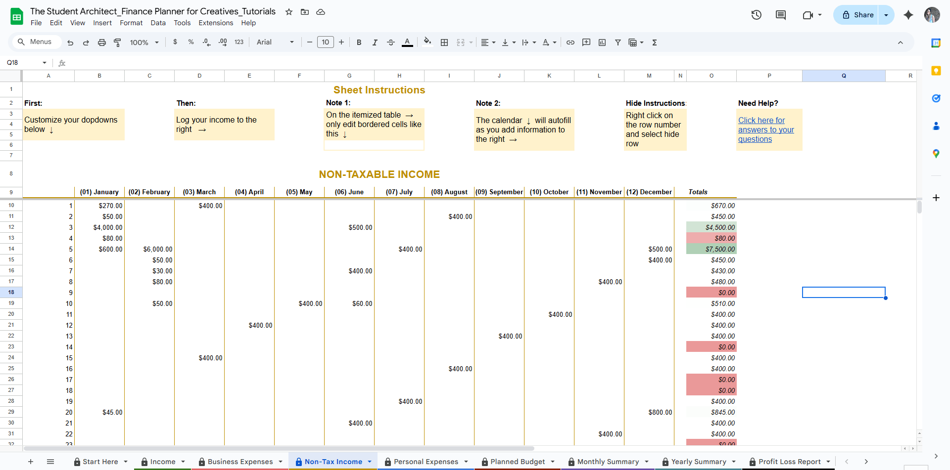 Many sheets in the Finance Planner for Creatives include instruction rows to help you understand how to use each section. Once you’re familiar with how things work, you may want to hide these to keep your workspace clean and focused.