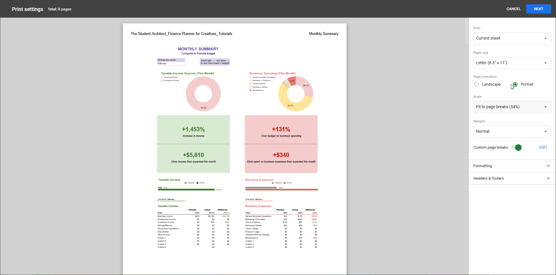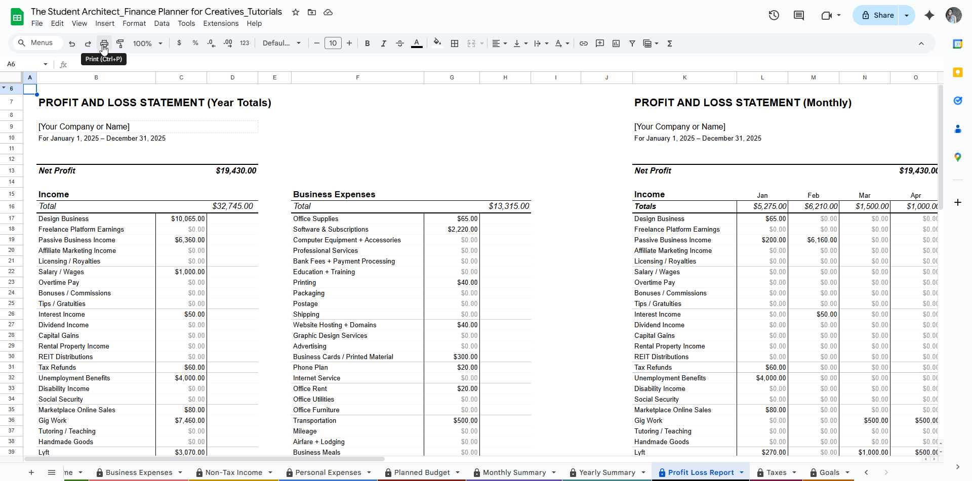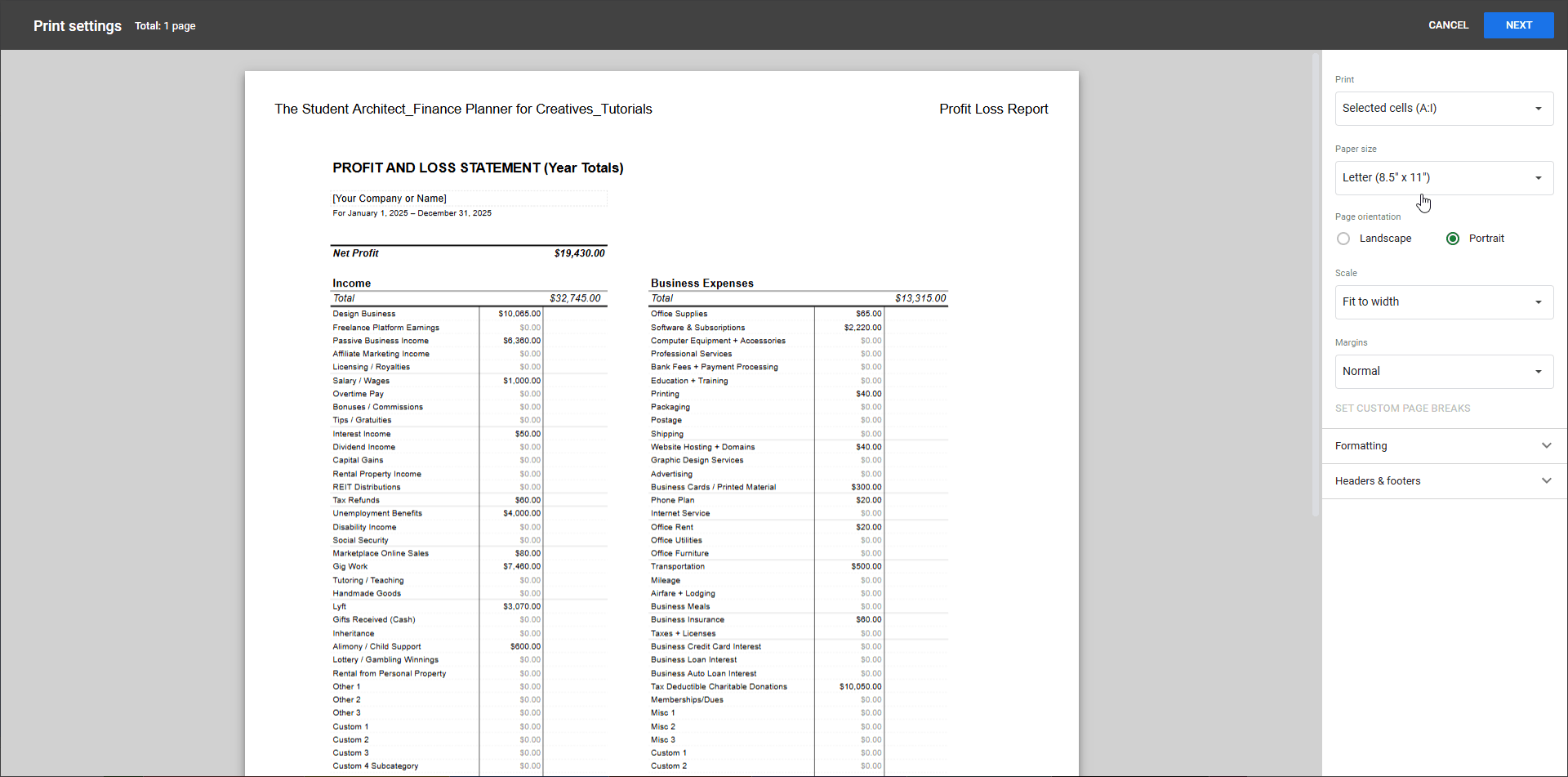 Need a hard copy of information from your Finance Planner for Creatives for a meeting, your accountant, or just for your own records? Google Sheets gives you plenty of control over what and how you print. Here’s how to get the results you want: