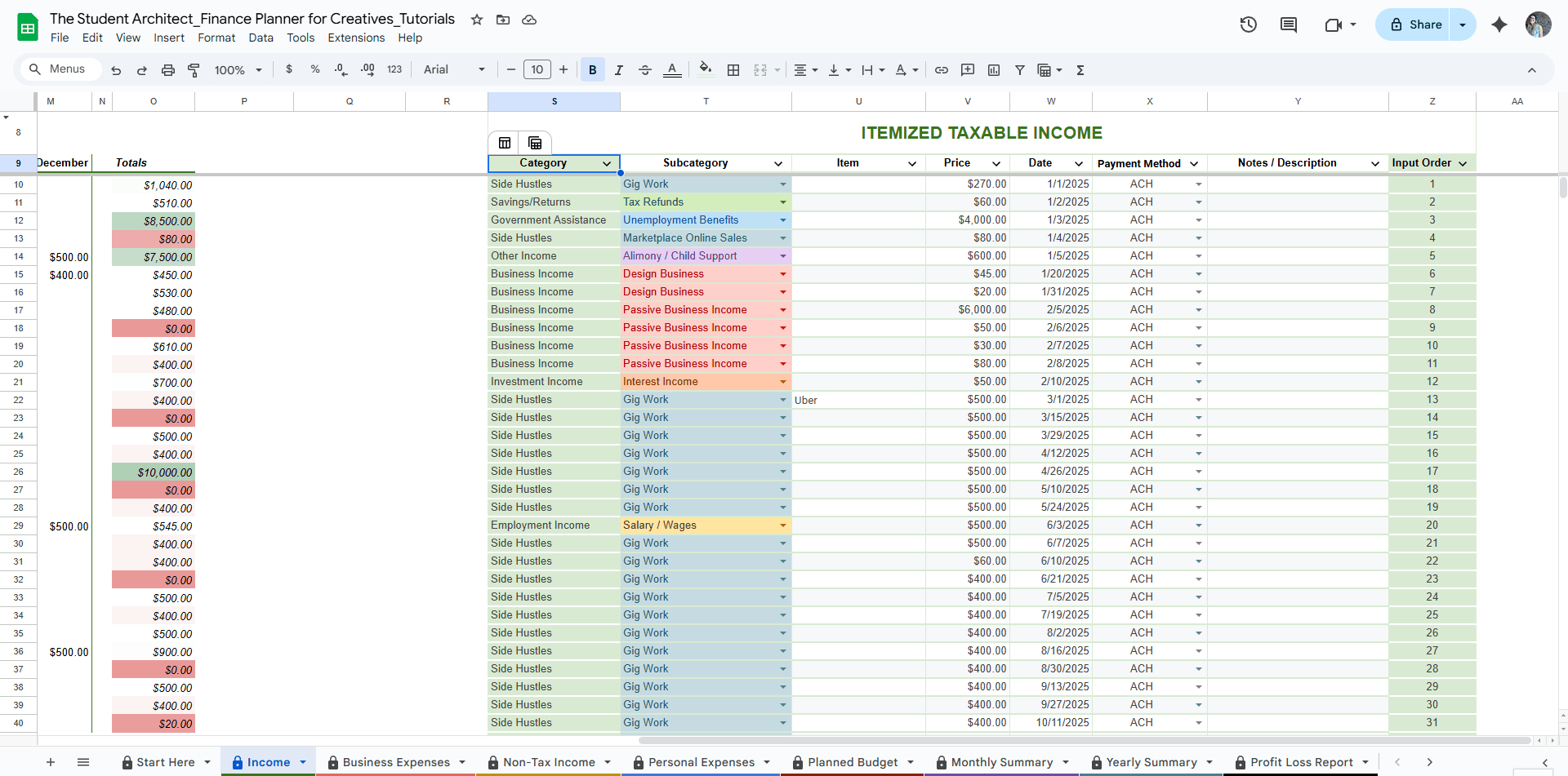 How to Sort Tables (Like Income + Expense Logs) in the Finance Planner for Creatives